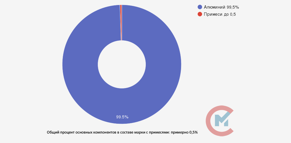 В сплаве содержится 99,5% алюминия, до 0,02% меди, до 0,03% магния, до 0,05% марганца, до 0,25% кремния, до 0,06% цинка, до 0,02% титана, до 0,3% железа и до 0,03% галлия. Примеси составляют не более 0,5%, но имеют большое значения для качества изделий.