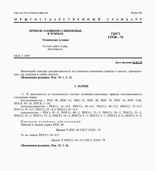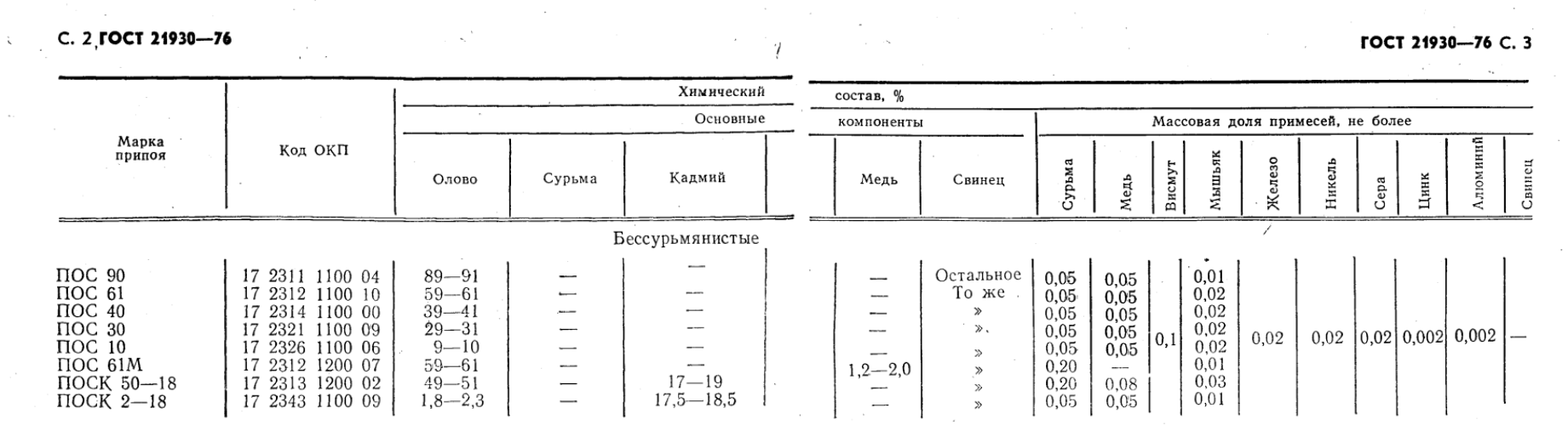 Марка ПОС61 – сплав, содержащий не менее 59% олова и около 39,5% свинца. Олово данной марки соответствует требованиям ГОСТ 21930-76, а процентное содержание примесей строго регламентируется этим стандартом.